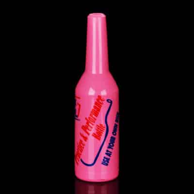 Sauf qu’à la place du verre, la bouteille de flair bartending rose est intégralement faite en plastique.