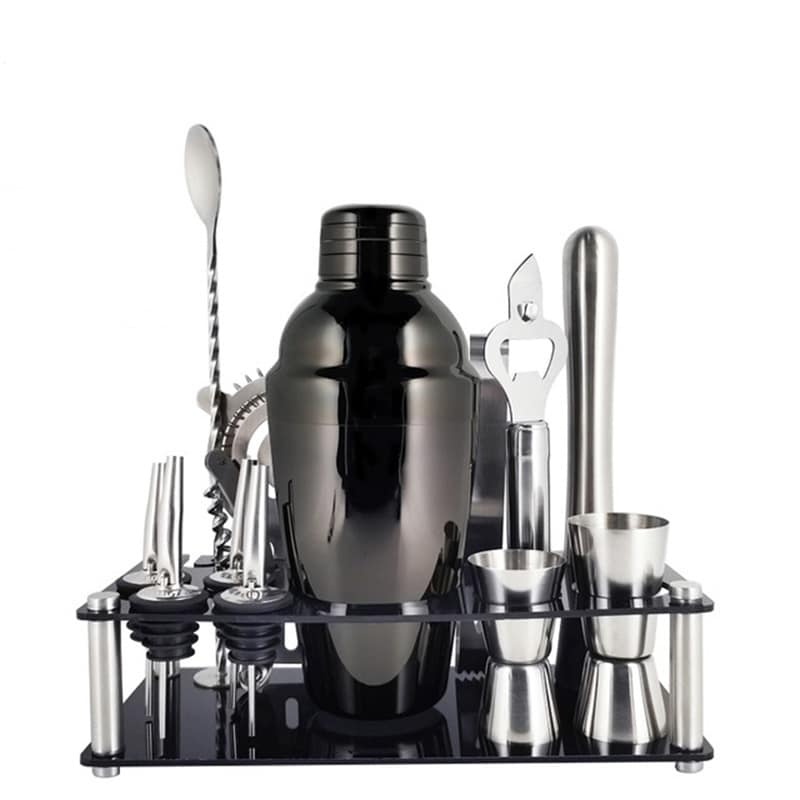 | Ustensiles | 1 Shaker Cobbler de 550ml, 1 Passoire, 4 Becs Verseurs, 1 Limonadier, 2 Jiggers, 1 Cuillère à Cocktail Torsadée, 1 Pilon à Mojito, 1 Décapsuleur, 1 Pince à Glace, 1 Support de Rangement |
