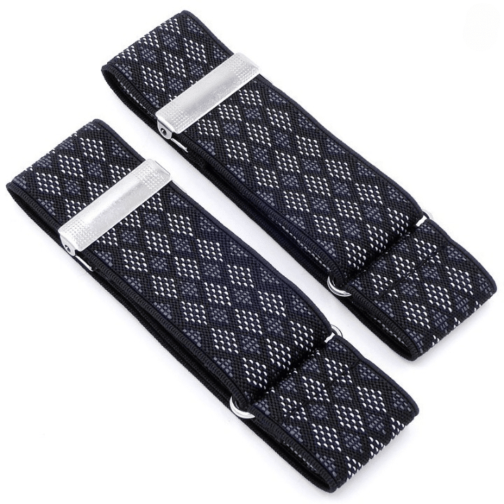 Associant des losanges blancs, bleus foncés et gris, les tours-de-bras pour chemise de barman sont un vrai régal pour les yeux.